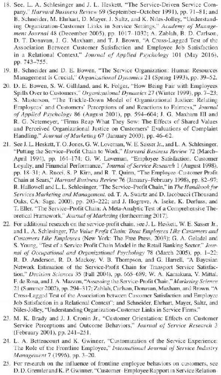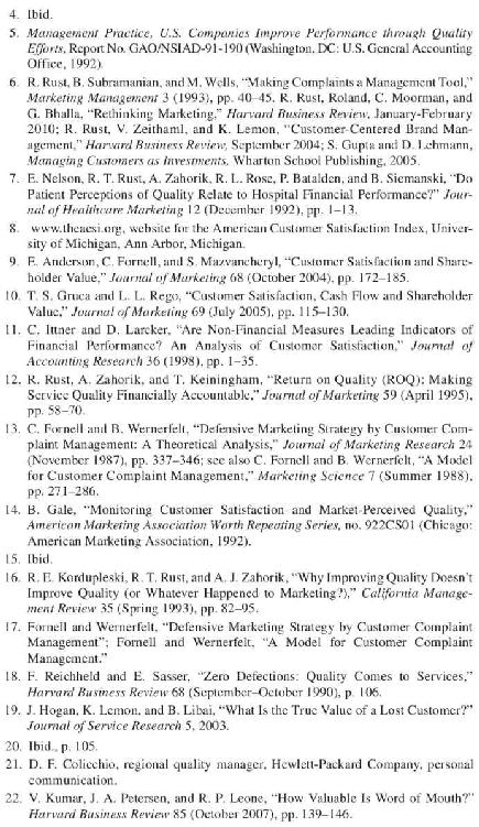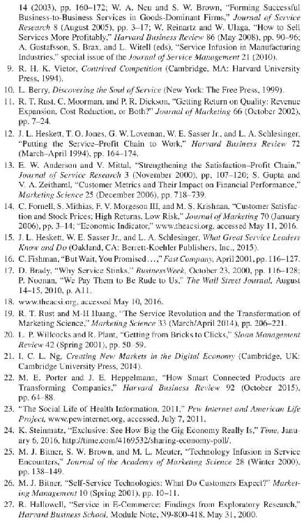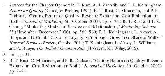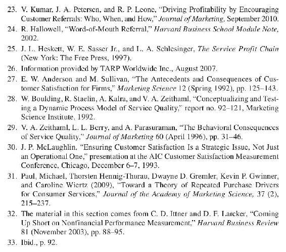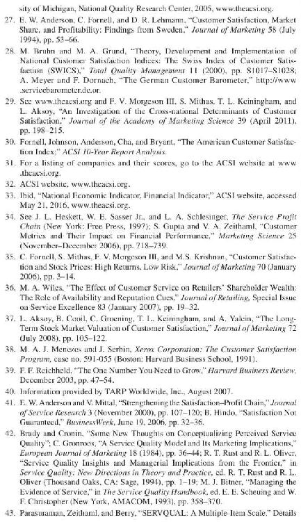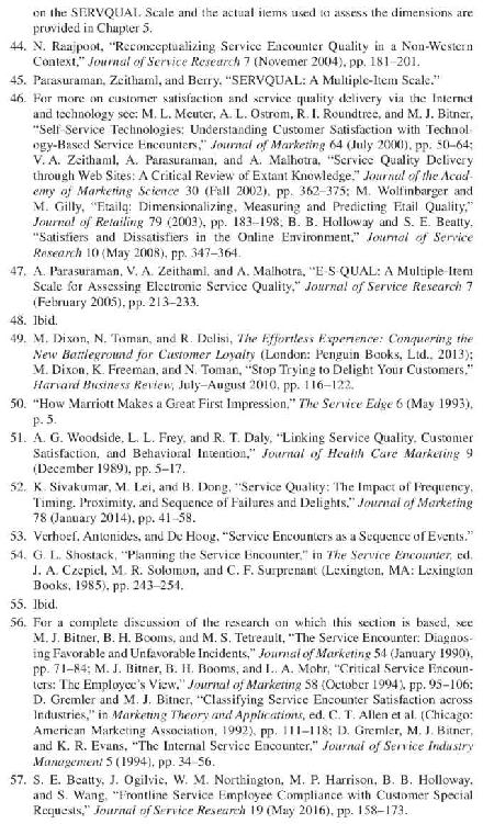 本章應用一個概念性框架將五個課題中的所有可變因素聯繫起來:①服務與盈利性之間的直接關係;②服務質量具有進取性作用,獲得新顧客的能力;③服務質量具有防禦性作用,保持現有顧客的能力;④服務質量和購買意願之間的關係;⑤服務質量、顧客保留和利潤的關鍵驅動因素。研究人員對服務質量、獲利能力和顧客的經濟價值等做了研究調查,並取得了相當可觀的進展,但還存在許多未解答的問題,而這些問題可以幫助管理者做出精明的服務質量投資決策。本章還討論了忠誠度的評價方法,包括流行的淨推薦值,以及利用顧客資產模型來評價市場回報。本章結尾討論了用績效平衡計分卡方法評估企業績效,這為評估公司績效的所有方面提供了一種戰略方法。