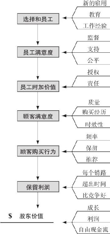 (1)沒有把評估和戰略聯繫起來。企業能夠簡單地識別上百種無財務的評估,但是它們也有必要使用分析去識別戰略中最重要的驅動。成功的組織使用有價值的驅動匹配以及展示了驅動和戰略成功之間因果關係的工具。圖16-7展示了所開發的原因模型,通過一個成功的快餐連鎖店來理解股東價值的關鍵驅動。被識別的要素在右邊,最重要的主導內容在左邊,一連串的內容從頭到尾顯示的是企業戰略(如選擇和員工)和中間結果(如員工和顧客滿意度)——能導致財務結果(如保留利潤和股東價值)的關係。研究發現,不到30%被調查的企業使用這個原因模型方法。