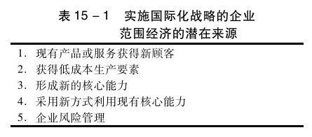 即使一些企業爭相利用同樣的國際化機遇,稀缺標準同樣能滿足,只要某一企業在國際化競爭中採用的資源和能力是稀缺的。稀缺資源和能力包括獨特的營銷技能、高度差異化的產品、特殊技術、卓越的管理人才和規模經濟。47從某種程度上來說,在競爭性企業中,某個企業能夠運用稀缺資源和能力實現一項範圍經濟(表15-1所列),那它就能從國際化戰略中獲得至少是暫時性的競爭優勢。