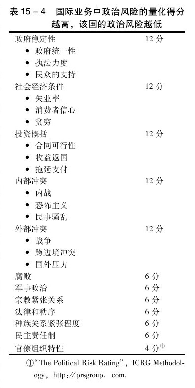 政治風險評估 對實施全球化戰略的企業來說,現在已經有各種方法能系統地評估政治風險。這些方法在細節上有所不同,國際國家風險指南中所運用的標準被廣泛採納,該指南由PSR集團開發,見表15-4。在該方法中,政治風險是12項因素的函數,從政府穩定性到官僚組織特性。一個國家在這些維度上得分越高,說明在該國實施國際化戰略的政治風險越低。例如,2009年,海地具有很高的政治風險(42.5分),在社會經濟條件(0/12)、腐敗(1/6)和官僚組織特性(0/4)方面的得分都非常低。芬蘭的政治風險最低(92分),在投資概括(12/12)、腐敗(6/6)、軍事政治(6/6)、宗教緊張程度方面得分很高。美國的政治風險接近芬蘭,總分為82.5。[1]