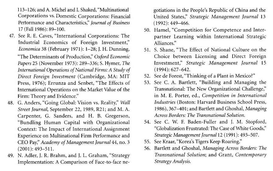 總的來說,對實施國際化戰略的經濟結果的研究沒有統一定論。有些研究發現實施國際化戰略的企業績效優於那些只有國內市場的企業。45然而,大部分研究並沒有對企業國際化戰略中試圖實現的特定範圍經濟進行考察。此外,一些研究則試圖採用會計績效評價方法來評估國際化戰略對企業績效的影響。其他研究發現採取國際化戰略的企業風險調整後的績效與僅採取國內戰略的企業相同。46