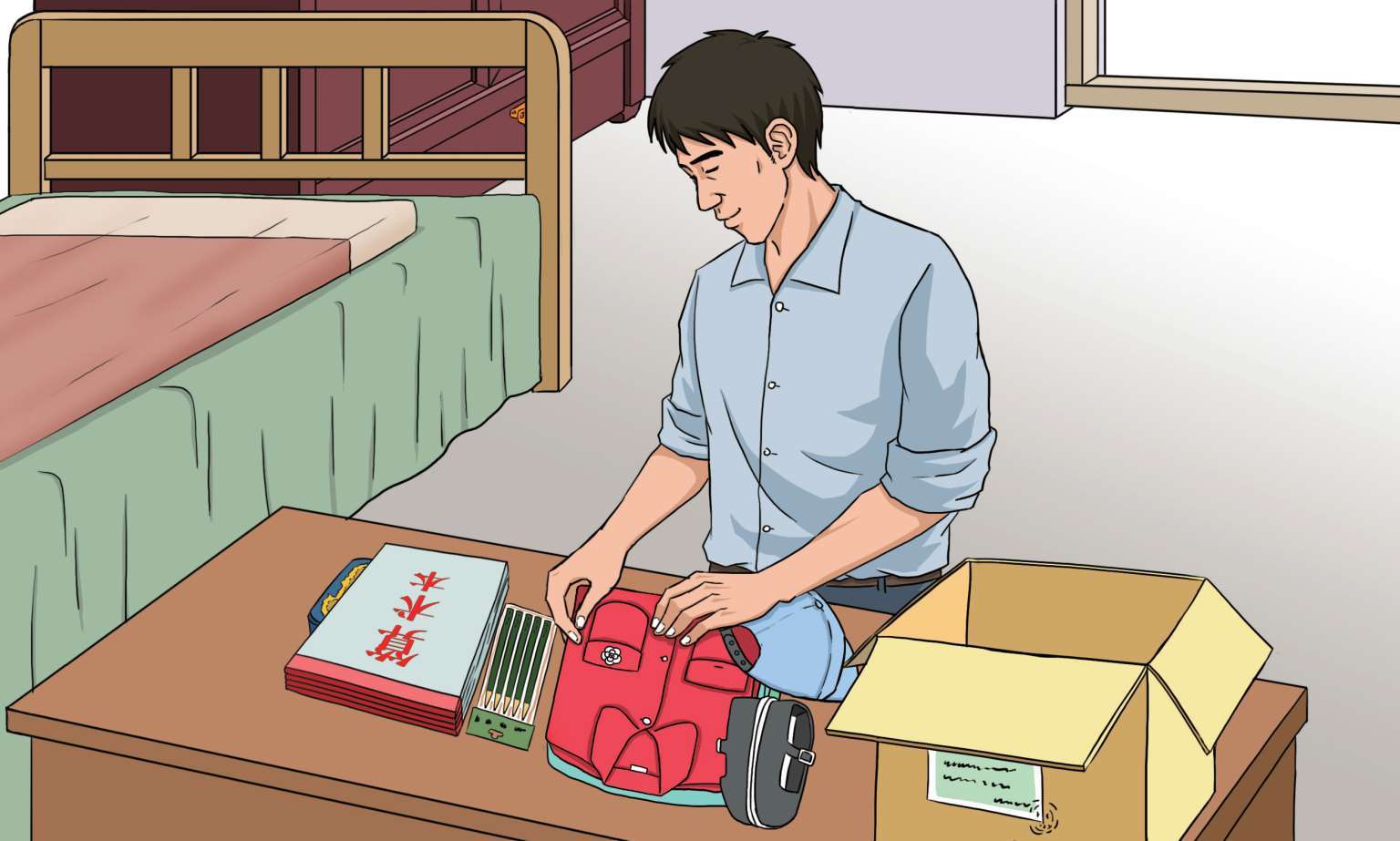 (5、10)那人還給方小草寄了一包東西。方向強把那包東西從郵局取回來,翻過來翻過去,前後左右,在包上到處找,想看看是從什麼地方、是什麼人寄來的。但是,包上除了寫著什麼地方什麼人收以外,沒寫別的字,郵戳[27]裡面也只有“北京”兩個字還能看得清楚。方向強把包打開[28],裡邊東西真多啊!有學習用的筆、本子[29],還有衣服、鞋、帽子等生活用的東西。不過,最讓他注意的是一件紅襯衫。