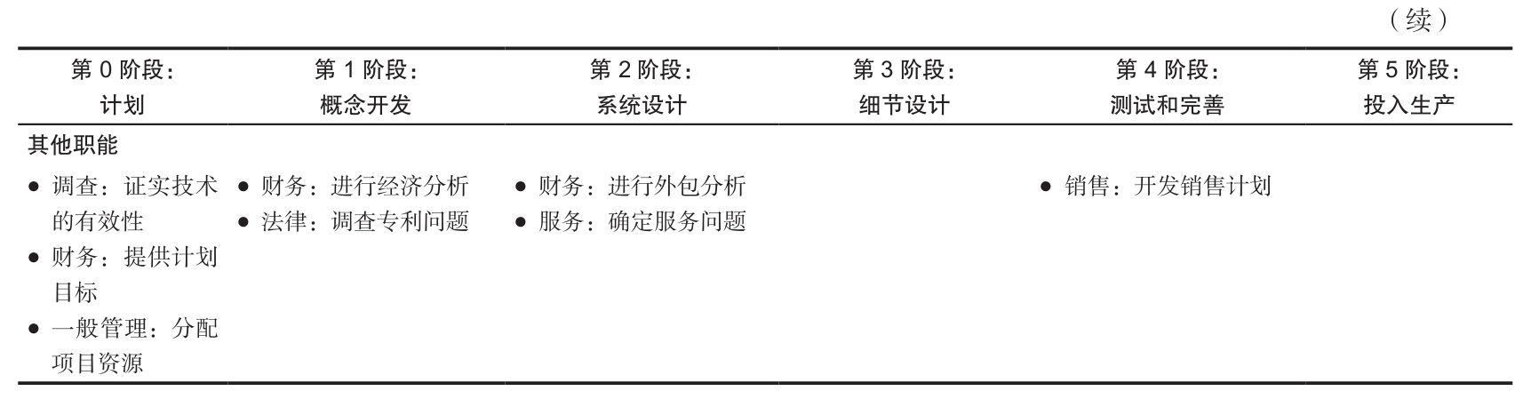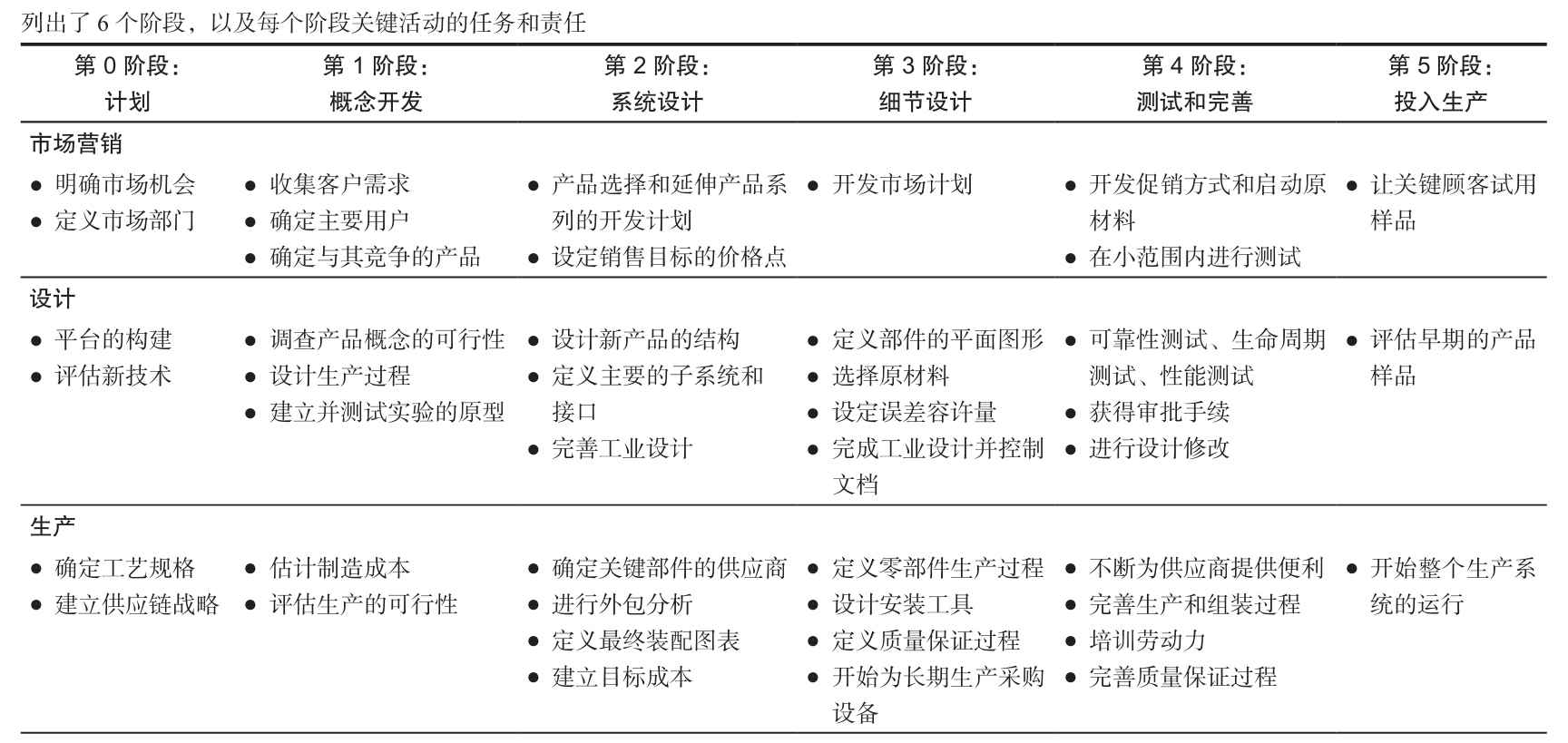 我們的產品開發過程包括6個階段,如表3-1所示。這一過程從計劃階段開始,計劃階段包括前期研究和技術開發活動,計劃階段的工作成果是項目陳述,它是概念開發階段初期的必要信息,同時對開發團隊有一定的指導作用。在產品設計階段之後是產品投放,這時產品成為市場上可以購買的產品。表3-1顯示了公司在各個開發階段不同職能的關鍵活動和責任。隨著過程的不斷深入,我們描述了市場、設計和製造的不同作用。其他有代表性的功能,如調查、財政、地區服務和銷售,也在這些過程中起著關鍵的作用。