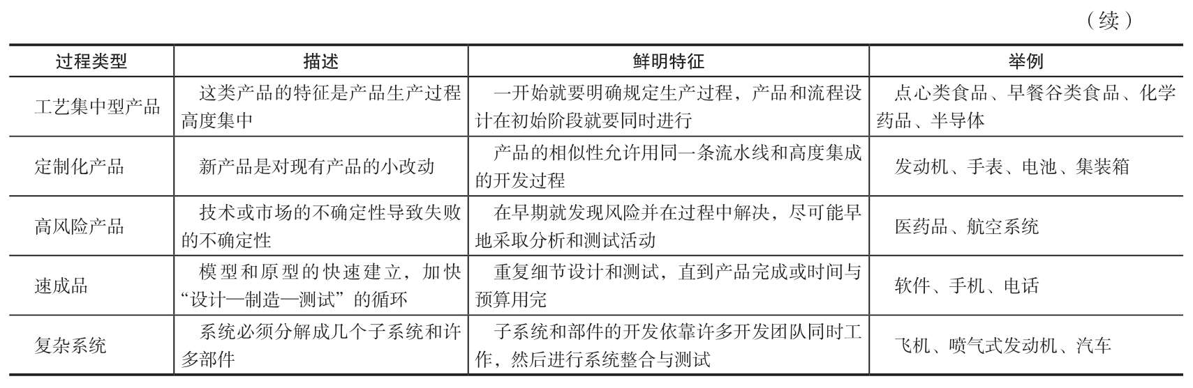 表3-1描述的開發過程是一般性的,具體的過程根據企業各自的特殊情況而有所不同。一般來說,其符合市場拉動作用下的過程。市場拉動 (market-pull)是企業根據市場機會開發新產品,並利用一切可行的技術滿足市場需求(即市場“拉動”了開發的決策)。除了市場拉動的產品開發過程外,其他情況也普遍存在,例如技術推動型產品、平臺產品、工藝集中型產品、定製化產品、高風險產品、速成品和複雜系統。表3-2對每一種情況進行了討論,並總結了這些過程的特徵及其與一般過程的區別。