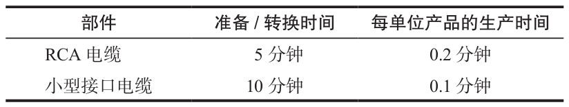 工廠目前每生產100個RCA電纜後會生產100個小型接口電纜,然後再生產100個RCA電纜和100個小型接口電纜,如此循環。下表給出了每種電纜的生產時間和準備時間。
