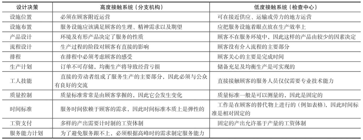 從這些概念來說,與顧客接觸程度低 (low degree of customer contact)的服務系統相比,顧客接觸程度高 (high degree of customer contact)的服務系統將更難控制和優化。在高度接觸系統中,顧客可以影響服務的需求時間、服務的具體性質以及服務質量或者感知質量,這是由於顧客參與了這個過程。