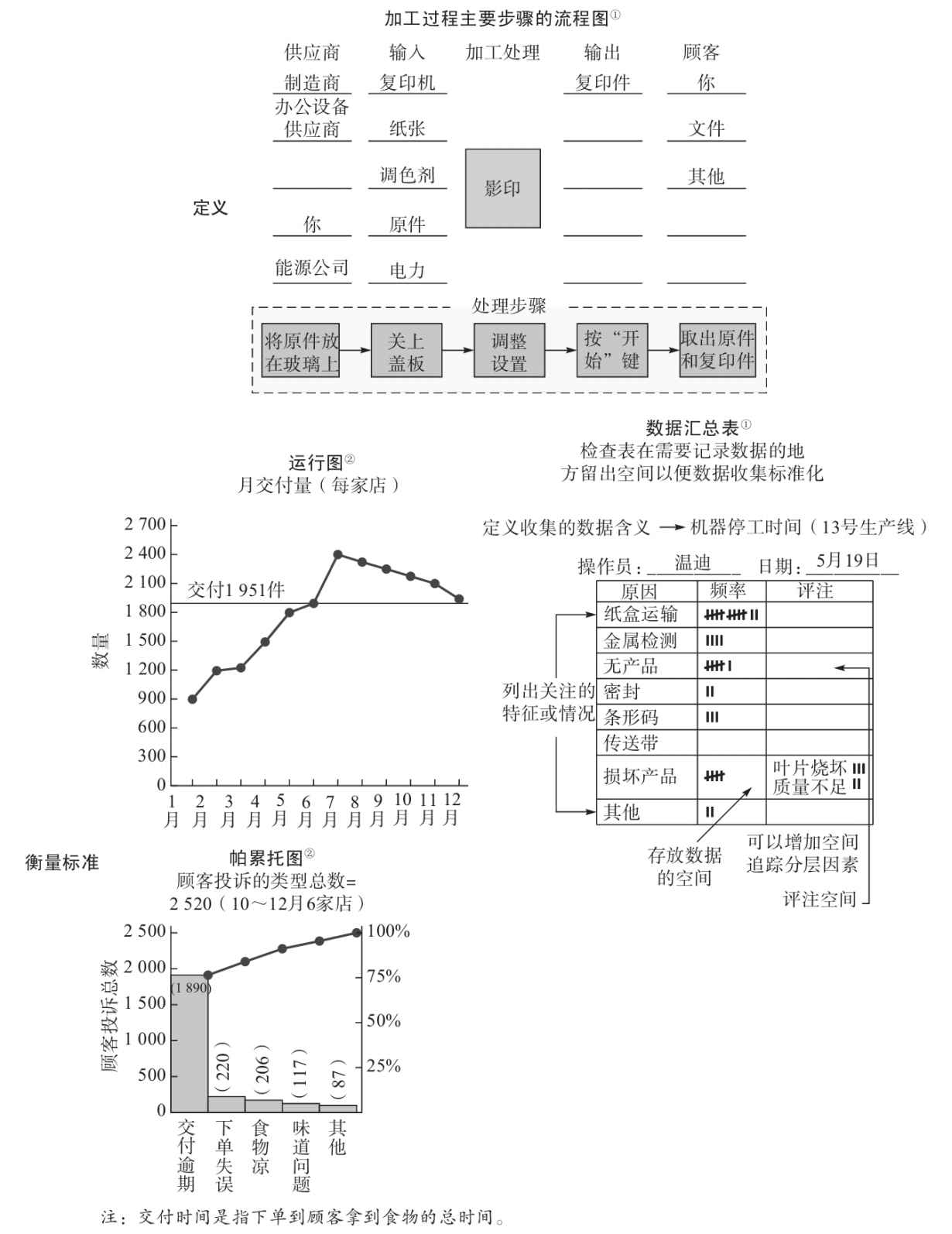 帕累託圖 (Pareto chart)。這些圖可以幫助我們把一個問題分解成各個部分。它們是以普遍的經驗發現為基礎的,即大部分問題是由於少數原因造成的。在例子中,80%顧客的抱怨是由於送達的延誤導致的,而這個原因只佔所有列舉的原因中的20%。