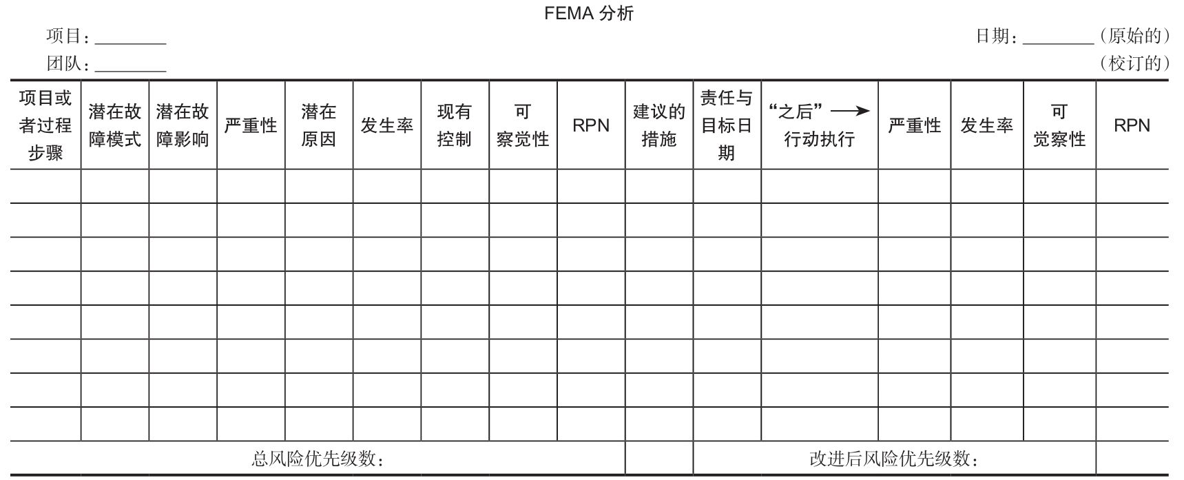故障模式影響分析 (failure mode and effect analysis,FMEA)。這是識別、估計、區分優先次序和每階段可能發生故障的風險評估的結構化方法。首先識別每個要素、裝配線、過程的各個部分,列出潛在故障的模式、潛在原因、每種故障的影響。計算每種故障的風險優先級數(risk priority number,RPN)。它是用於衡量FMEA圖表上列出各項的重要性排名的指數,可參見表12-5。考察的條目包括故障發生的可能性(發生率)、故障帶來的損失(嚴重性)、內部檢測到故障的概率(可察覺性)。RPN高的項目要優先改進。FEMA建議指派一個負責的人或者部門通過對系統、設計、過程進行重新設計,並且重新計算RPN來消除故障。