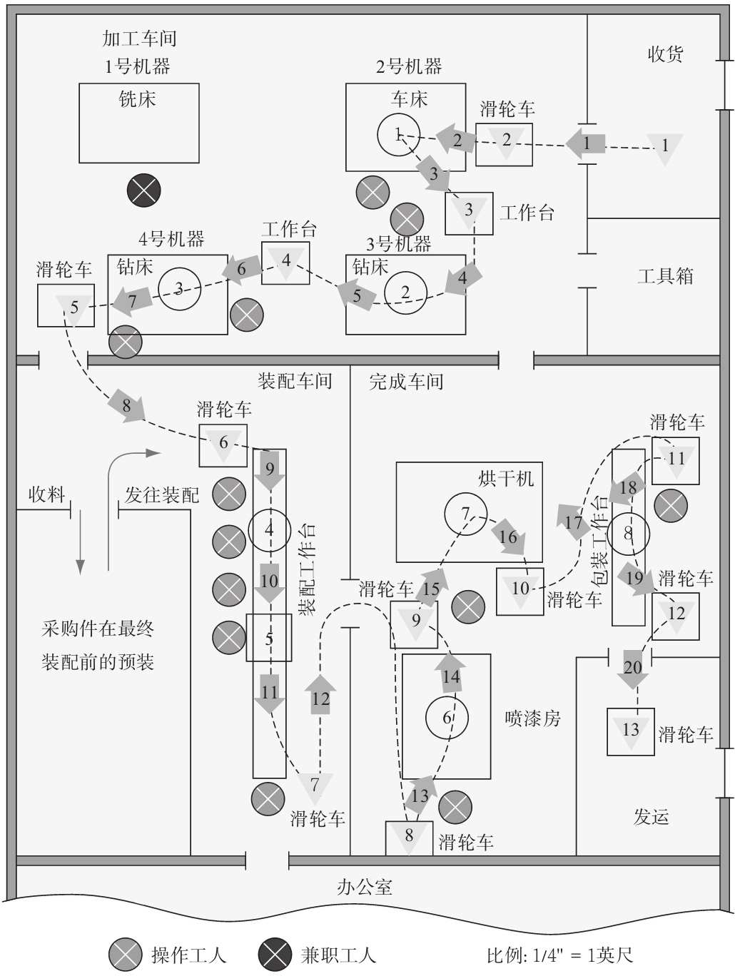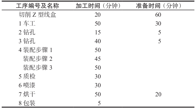 X型和Y型線盒的生產流動過程如圖14-13所示。Z型線盒的第一步是切削,後續生產過程與X型、Y型一致。一輛滑輪車一次至多可以盛放20個線盒。表14-2給出了每單位產品在各工序上的大致加工時間以及機器設備的準備時間。