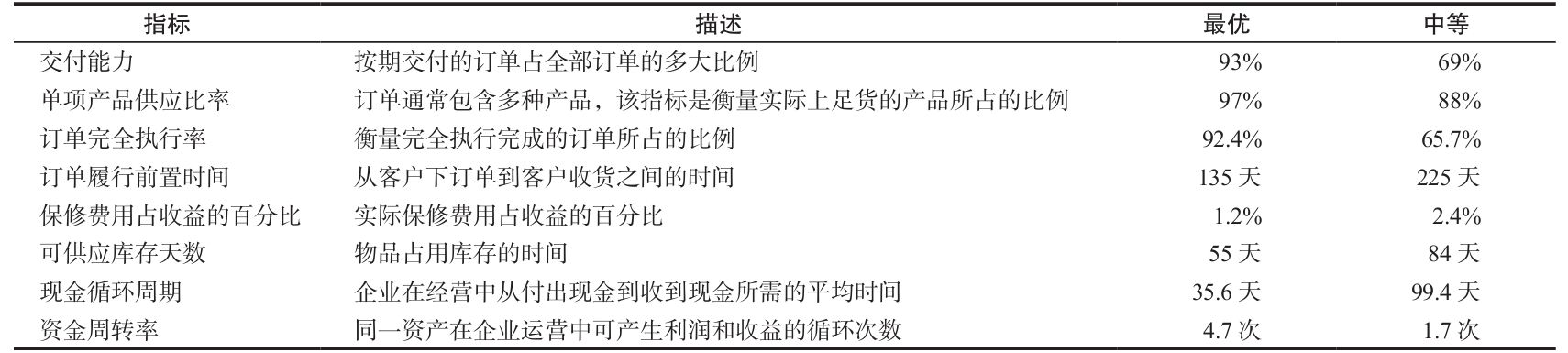 APICS供應鏈委員會提供了多種衡量供應鏈整體績效的指標,這些指標能夠幫助實現企業之間供應鏈績效的比較。表17-2展示的是各類指標中優秀和中等的標準,這些指標主要針對典型大型工業產品。供應鏈針對不同類型的企業制定了類似的指標。