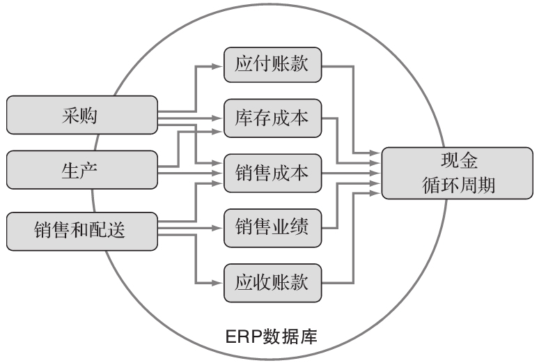 事實上,現金循環週期是為原材料付出現金到收到客戶為產品所付現金所需的平均時間。從式(17-1)中,各部門協調合作的作用可見一斑。ERP系統可直接進行這些計算。現金循環週期包括三部分:應收賬款週期、庫存週期、應付賬款週期。