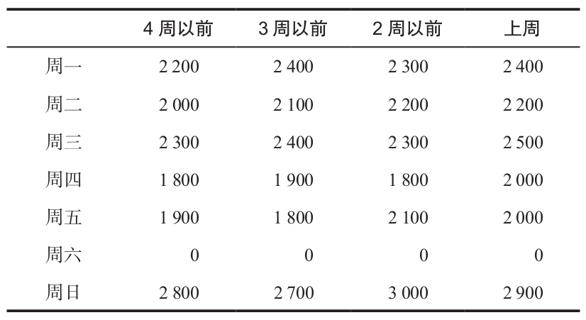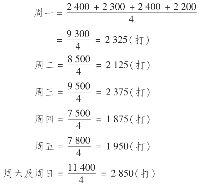 日升烘焙公司向一系列的食品商店銷售油炸圈餅。公司一直經歷著因為預測錯誤所導致的過剩以及供不應求的狀況。下面的數據是它過去4周以來對油炸圈餅的需求(單位是打)。油炸圈餅是為第二天生產的,例如,週日油炸圈餅的生產是為了滿足週一的銷售,週一的生產是為了滿足週二的銷售,依此類推。麵包店在週六會關門,因此週五的生產必須能同時滿足週六和週日的需求。