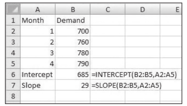 對於線性迴歸法,利用1~4月的需求數據來匹配迴歸線。利用Excel的迴歸函數SLOPE和INTERCEPT來計算這些值。
