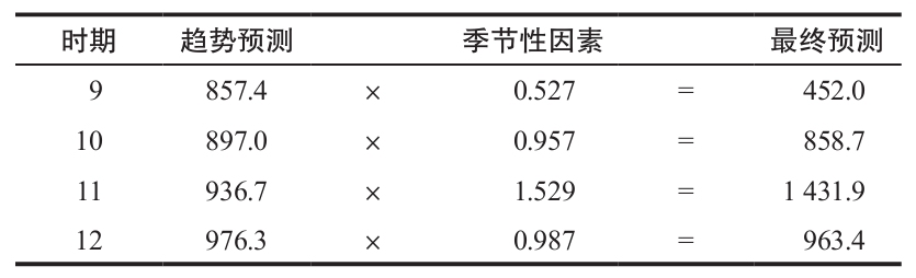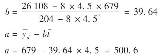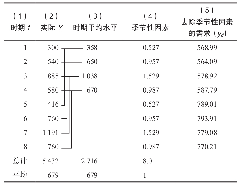 第4欄是季度平均(第3欄)除以總平均(679)。第5欄是實際需求量除以季節指數。要計算t2和ty,我們建立如下表格。