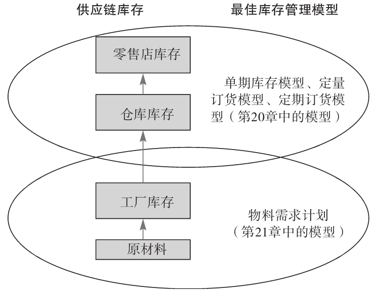 圖20-1給出了面向庫存生產模式下,供應鏈中存在的幾種庫存類型,一般是直接針對顧客的產品類型。在供應鏈的上端,也就是靠近顧客的供應端,持有庫存是為了在顧客有需求時能更快地將產品送給顧客。當然,還有很多例外,這只是一般情形。原材料和工廠生產庫存位於梯形的下端,這有利於該部分供應鏈的計劃和同步化的高效管理。在這裡,本章描述的模型最適合上端的庫存類型(零售庫存和倉庫),而下端的庫存類型應當使用第21章中介紹的物料需求計劃(MRP)技術。這些模型的適用性在其他的情境中可能會不同,例如直接向客戶交付產品的飛機制造行業。