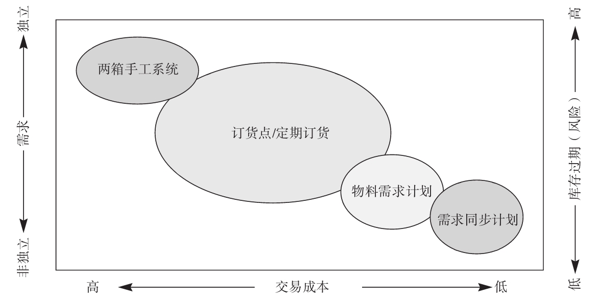在庫存管理中,瞭解各種庫存管理模式之間的關聯是非常重要的。圖20-2給出的是不同庫存管理系統在需求、交易成本以及呆滯庫存風險方面的特點。圖中左上方的幾個系統是本章要討論的,右下方的幾個系統會在第21章中討論。