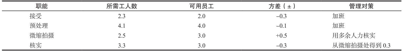 為解決問題,銀行要對每個產品的每項功能做出日需求量的預測。這可以轉化為對每項功能所需工人工時數的預測,也就是說可以轉化為對每項功能所需工人數的預測。這些數字被列表、彙總,根據缺勤和休假情況調整之後得出調度工時。最後將它們除以每個工作日的工作小時數得到所需工人數,這樣就得到了每日員工工作調度(見表22-4)。這就是部門人員調度的基礎,部門人員調度列出了所需工人數、可用人員、方差和針對方差採取的管理對策(見表22-5)。