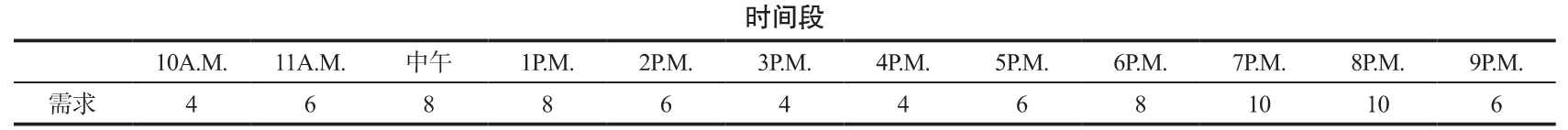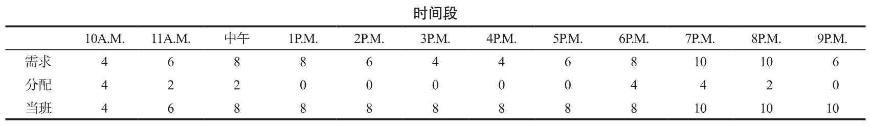調度中4名工人被指派在上午10點工作,到上午11點增加兩名員工,到中午12點又加入兩名員工來滿足需求。從中午到下午5點,我們有8名員工當班。注意下午2~6點有富餘的人員。上午10點開始工作的4名工人在下午6點結束工作,這時加入4名員工開始新的班次。兩名員工上午11點開始工作,晚上7點結束工作,這時當班員工數又下降到6名,因而7點又有4名員工開始新的班次,到晚上9點有10名員工當班,這時有富餘的人員,不需要增加員工。當新需求出現時再依此原則加入員工。