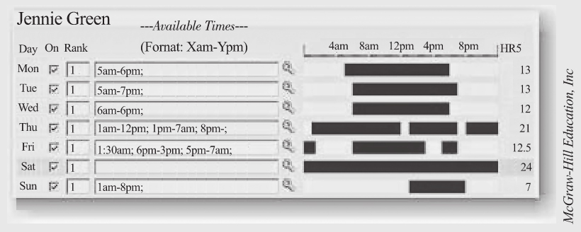像餐館這樣的服務行業每個小時都不同的人員需求。在高峰時候需要更多工人,在其他時間需要的工人較少。管理工作要隨時根據需求變化進行調整。這種人員調度可以運用一種簡單的原則:“第一小時”原則。看下面的例子可以更好地理解這個過程。假設每個工人連續8小時輪班工作。第一小時原則是指,對於第一小時我們指派到該小時工作的員工人數與該時段需要的人數相等。對於接下來的時段,補充指派人員使人員數能恰好滿足需求。在一個時段如果有一個或多個工人正好結束班次,那麼根據該時段的需求補充更多工人。下面的表格展示了一家24小時全天營業的餐館前12小時的人員需求。