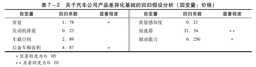 這個迴歸模型預測了每一種屬性對該產品的價格所產生的影響度。上述案例的顯著性統計是指對產品價格有重要影響的因素,即可被視為產品差異化基礎的因素。表7-2表明,加速器、制動能力以及後備車廂容積是影響汽車價格的重要因素,因此也成為市場中產生產品差異化的基礎。