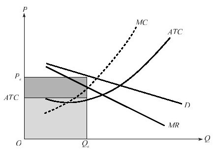 這四條曲線(D、MR、MC、ATC)可以決定公司在壟斷競爭市場中所獲得的經濟利潤水平。為了使利潤得以最大化,公司需要在邊際成本等於邊際收益的均衡點上生產Qe產量的產品。為了決定公司Qe產量產品價格,有必要在邊際成本等於邊際收益的均衡點上畫一條平行於縱軸的垂直線。這條線最終會與需求曲線交叉。當這條垂直線與需求曲線交叉時,沿著交點畫一條平行於橫軸的水平線,這樣就確定了公司產品的價格。在圖7-2中,這一點表示以Pe的價格生產Qe單位的產品,並且平均總成本小於價格。公司的總收入(價格×數量)在圖7-2中以陰影部分表示出來。總收入中經濟利潤所佔部分在圖中的陰影部分中以較深的顏色表示出來。因為在圖7-2中,陰影部分位於平均總成本上方,它代表了超額經濟利潤。如果這一部分是位於平均總成本下方,則它代表低於行業平均的經濟利潤。