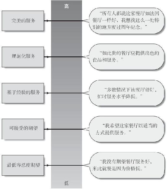 假如你計劃去一家餐廳用餐,圖3-1列出了顧客可能持有的服務期望序列。圖的左側列出了由高至低不同等級的服務期望,我們給每個等級的期望一個名字,並在右側說明對於目標飯店這個等級在服務方面的含義。顧客持有的服務期望對於其對服務績效的最終評判非常重要。抱有最低容忍度期望在一家餐館享受了物美價廉的食物和快捷的服務,和抱有最高的完美服務期望在另一家餐館享用了美味高價卻並不驚豔的食物,你認為哪家餐館會得到最好的評價呢?答案很有可能取決於你帶入這次服務體驗中的參照點。