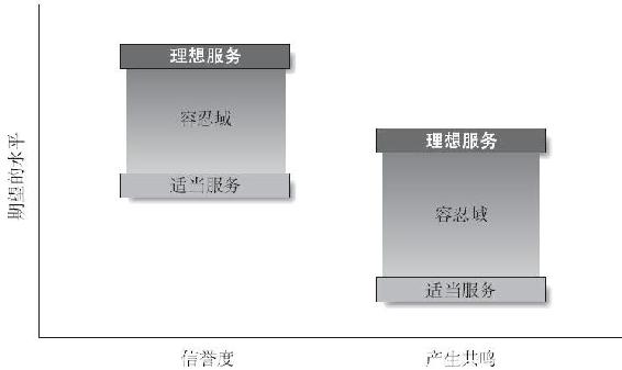 顧客的容忍域也因不同的服務特徵因素或不同的維度因素而變化。某項因素越重要,容忍域有可能就越窄。一般來說,顧客對低信譽度的服務(不信守承諾、服務出錯)比其他服務缺陷持有更低的容忍度。這意味著他們對是否可信賴這個因素持有更高的期望。顧客對不太重要的因素可能會降低自己的期望,但對於最重要的服務維度和特徵,除了對其持有較高的期望之外,相應的容忍域也會更小,理想服務和適當服務的水平標準會更高。6圖3-4顯示了就給定的一項服務,最重要因素(本例子中的信譽度)和相對不重要因素(如使顧客產生共鳴)的容忍域之間的可能差別。7