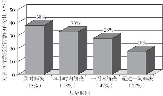 抱怨的顧客希望得到快速的反應。25這樣,當企業發生服務失敗或者接到顧客投訴時,必須隨時準備好快速回應顧客。如圖7-5顯示,對於服務業顧客的研究發現,對於那些問題得到迅速解決或者在24小時內解決的,他們對於企業採取的措施表示“完全滿意”。26不幸的是,很多企業在問題解決之前,要求顧客聯繫多個員工(就像打乒乓球一樣推來推去)。一項研究表明,如果要解決一個投訴,平均要聯繫4.2個人。27這項研究發現,如果問題在第一次聯繫就能得到解決,當時顧客對於企業反應的滿意度達到35%;但是,一旦需要聯繫3個以上的人,顧客對企業反應的滿意程度會降到9%。另外,對於那些使用推特的顧客,81%的顧客期望當天收到企業回覆,而且會通過他們的推特傳播。看得到教訓了吧?服務補救的快速反應對吸引不滿意的顧客是相當有好處的。