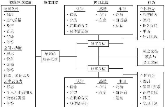 圖10-1描述了一個綜合性的“刺激—有機體—反應”範例,表明環境對多方(顧客、員工及其之間的交流)的影響、多種類型的內在反應(認識、情感和生理上的)以及由此引發的不同個人及社會行為等。