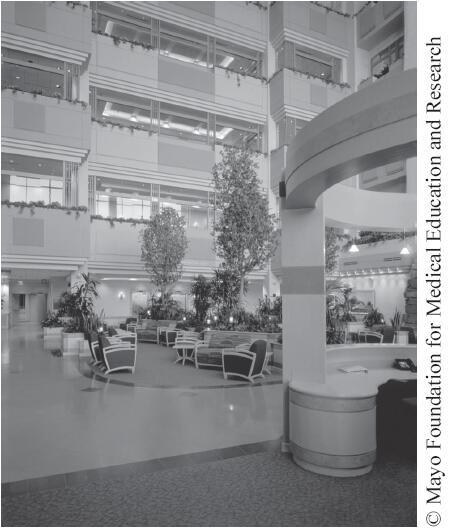 5層中庭輕鬆入口。當病人和其他人進入梅奧診所時,他們會看到一個5層封閉的中庭,這堪比一家豪華賓館的休息室。裡面放置著一架大鋼琴,整天都有志願者彈奏著美妙輕鬆的音樂。隨處可見的各類植物和透明玻璃使休息室舒適自然,這是一個人人喜歡的好地方。一進來,訪客就能清楚地看到在另一側正對著的電梯,因此不會因為不知走向何處而感到緊張。